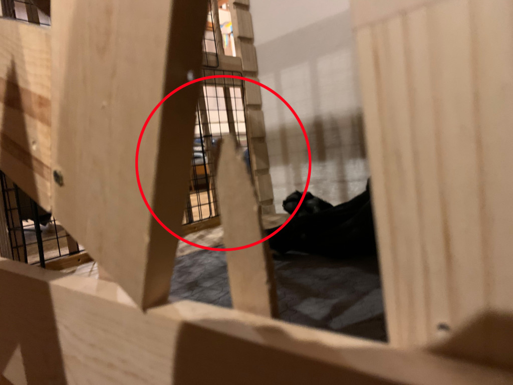 お察しのように、細い角材はガジガジされて、すぐに無くなります。