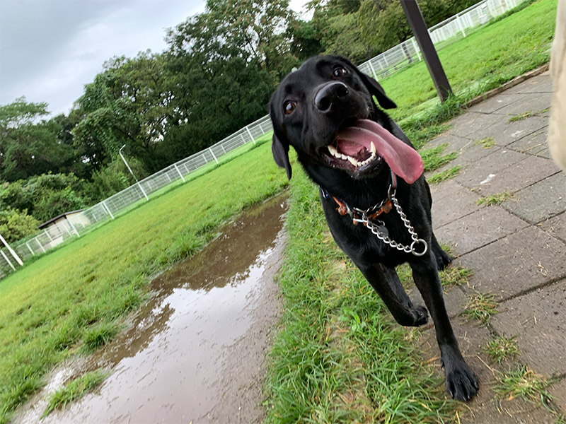 ハナは広い所に来て興奮気味。教科書どおりにリードを付けたままドックランを一周して落ち着いたところでリードをはなす。